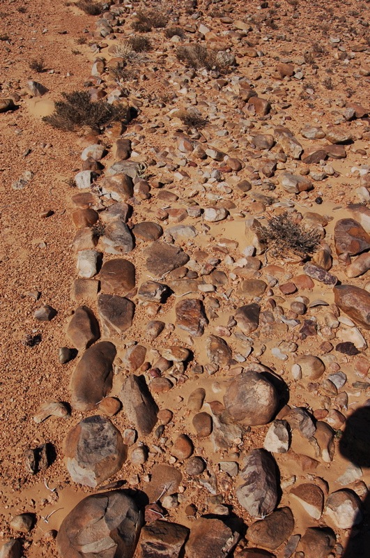 27°58,37’N - 10°47,07’W. A environ 9,5 km de Msied. Structure en ligne de chaque côté d’un petit tumulus arasé, développé de 35 m.